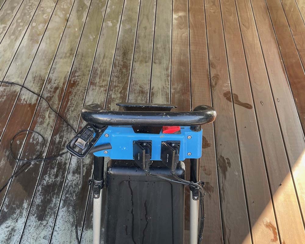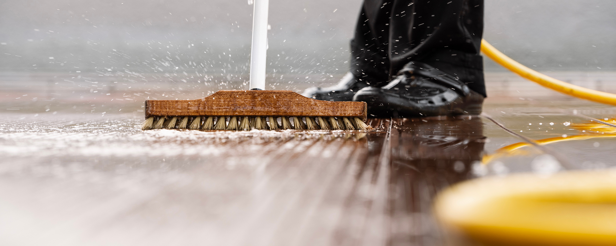 Eine regelmässige Reinigung ist der erste Schritt, um Ihre Terrasse in Topform zu halten. Entfernen Sie regelmässig Laub, Schmutz und Ablagerungen mit einem Besen oder einem Laubbläser. Verwenden Sie für hartnäckigere Verschmutzungen einen weichen Besen oder eine Bürste zusammen mit unserem Braun Parkett und Terrassenreiniger.