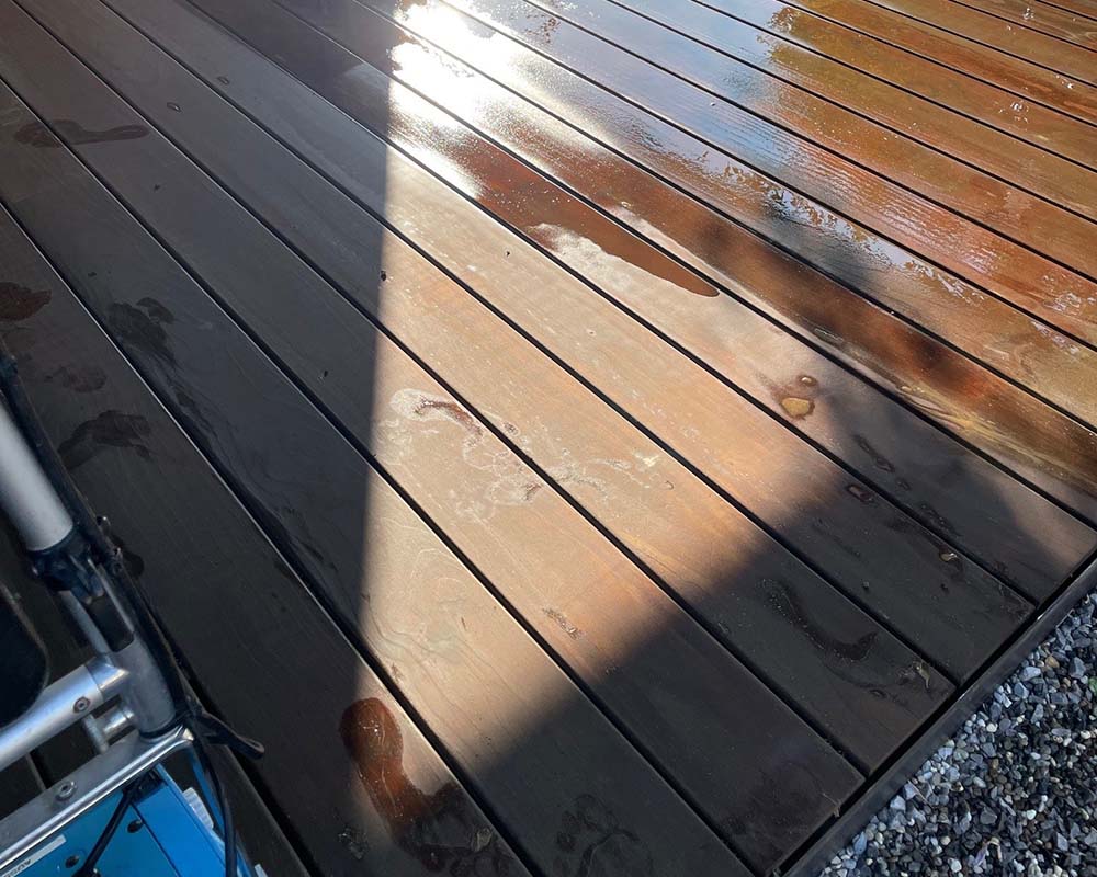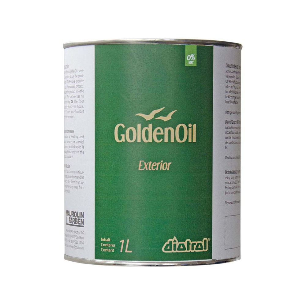 Für den besonderen Glanz und den langfristigen Schutz ist es ratsam, die Holzterrasse regelmässig mit Öl oder Lasur zu behandeln. Diese Produkte dringen tief in das Holz ein und schützen es vor UV-Strahlung, Feuchtigkeit und Schmutz. Zudem erhält das Holz so seine natürliche Farbe zurück und bleibt widerstandsfähiger gegenüber äusseren Einflüssen. Dafür empfehlen wir Diotrol GoldenOil Exterior Terrassenöl.